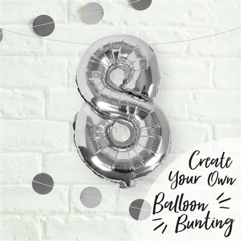 Pack Contains a Silver 16" 8 number balloon with straw to inflate. String is required to thread through holes on balloons to hang the balloons.