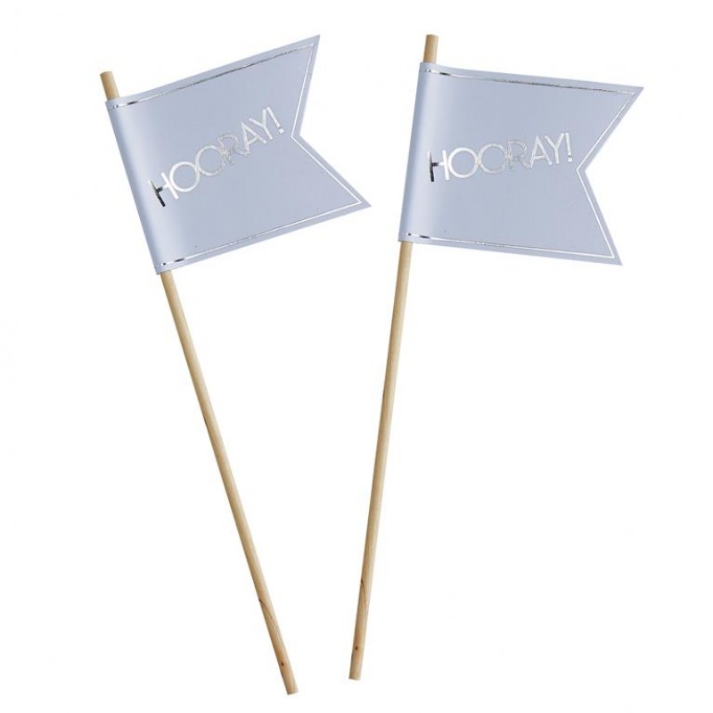 Each wand is around 30cm in length with foiled "hooray" wording on a white flag. Pack of 10.